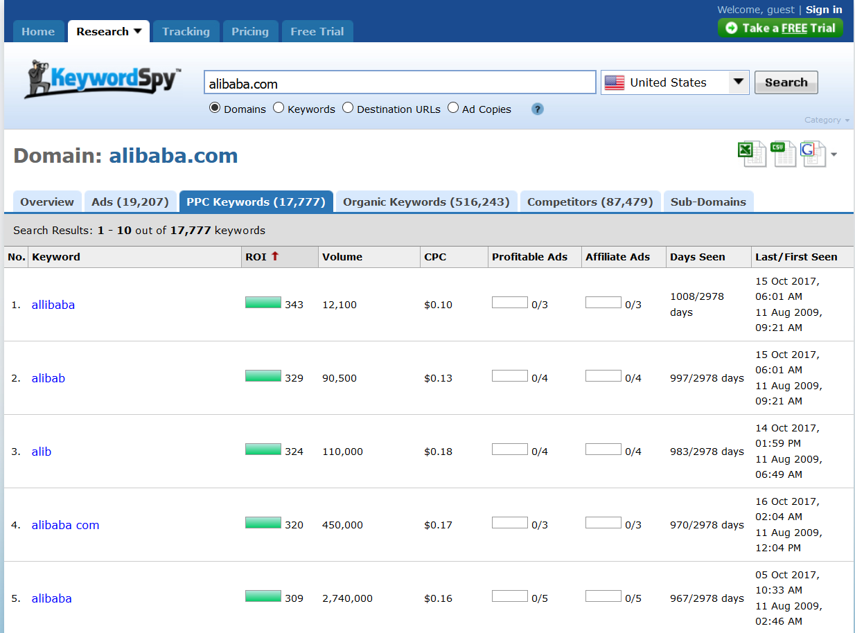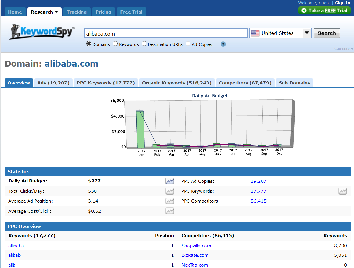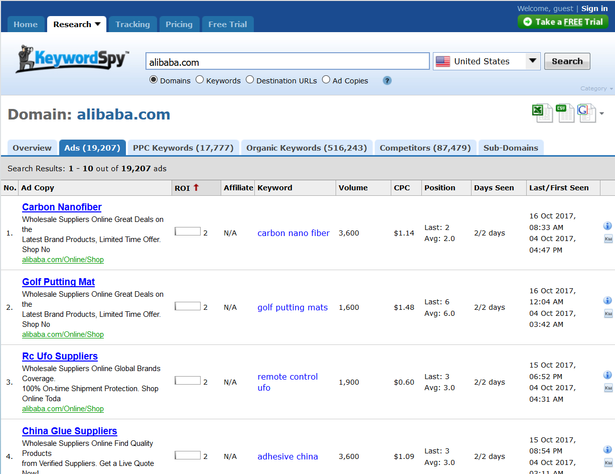 这里我们可以查询对手网站的竞价文案,直接输入竞争对手的网址,下面的选项选择domain,选择目标国家,点击搜索。以alibaba.com为例,如下图: