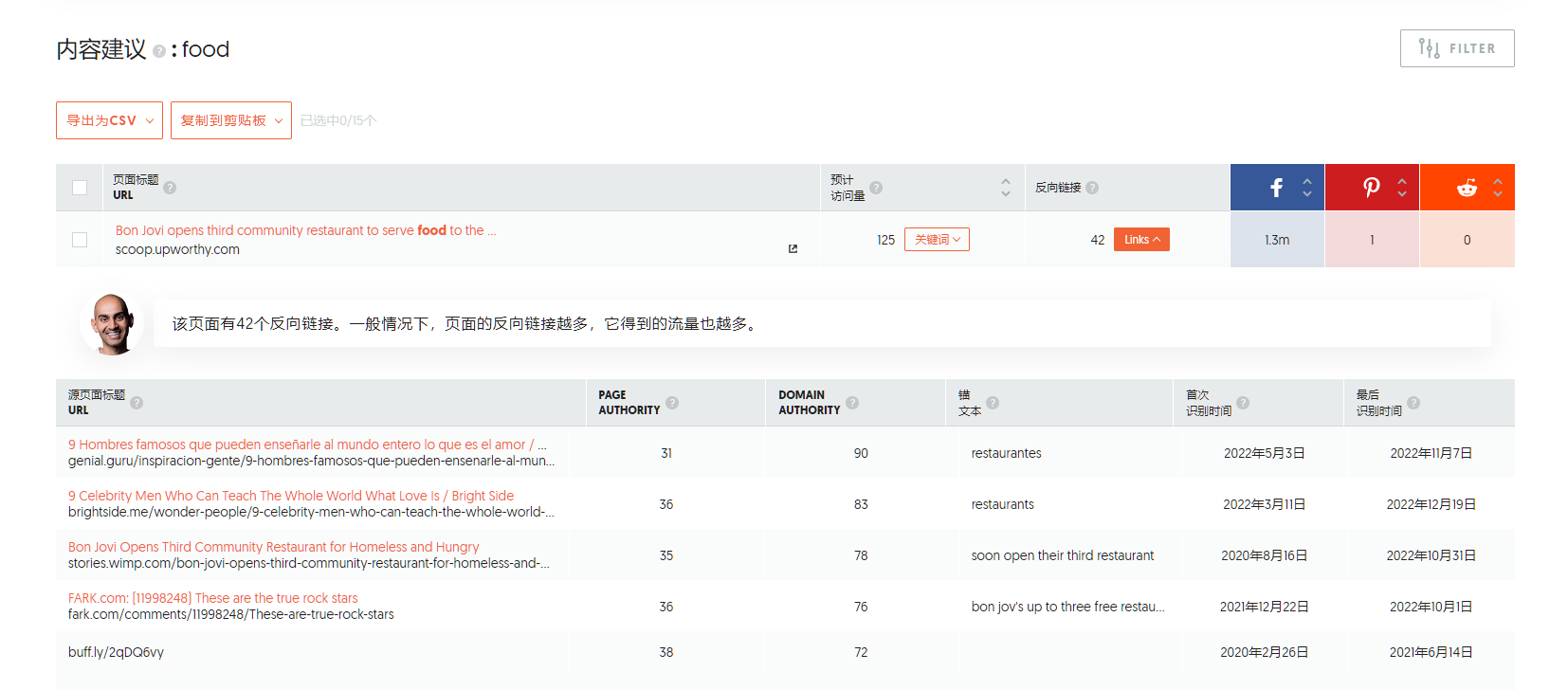 打开Ubersuggest,打开【关键词搜索】中的【内容建议】,就可以查看竞争对手的文章情况、反向链接以及在社媒上的传播情况,可以筛选比较优秀的文章来进行借鉴思考,如去分析写法,写比竞争对手更引人注目的标题,优化内容。保持在同类内容中依然脱颖而出,吸引优质外链资源平台的关注。