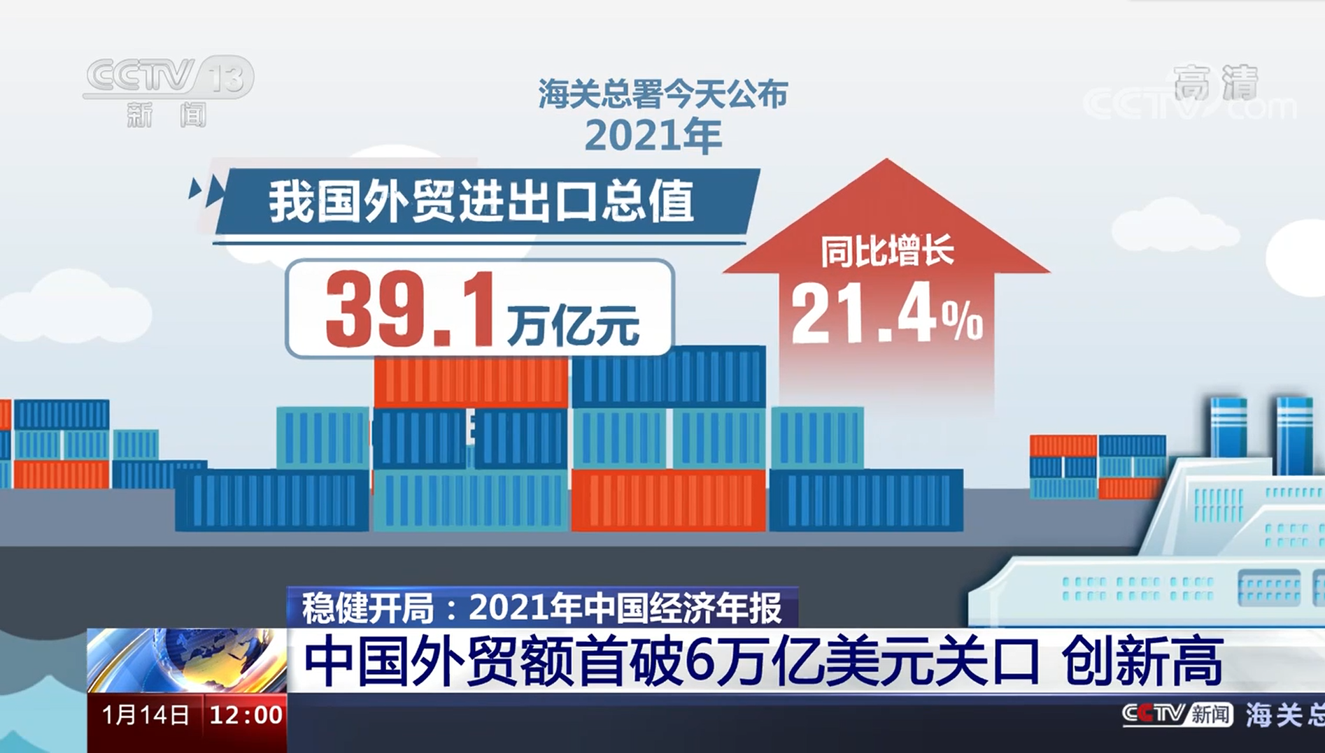 中国外贸再创新高!根据海关总署发布数据显示:2021年度,我国进出口规模再上新台阶,以美元计算,总值达到了6.05万亿美元,同比增长21.4%。
