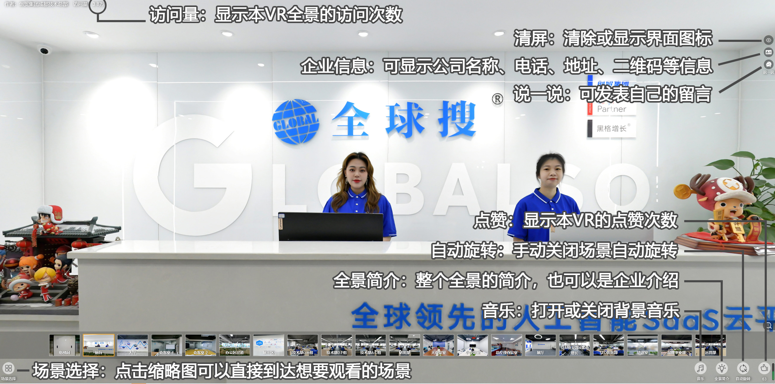 同一个全景里面,从A场景跳到B场景。比如,从商业大楼跳转到集团工作环境。