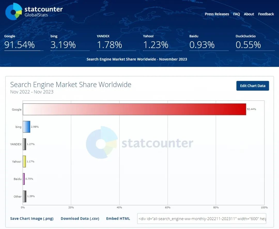 谷歌搜索主导地位:Google占据了全球搜索引擎市场高达91.54%的份额,远远超过Bing (3.19%) 和Yandex (1.78%) 等竞争对手(数据截止2023.12月)