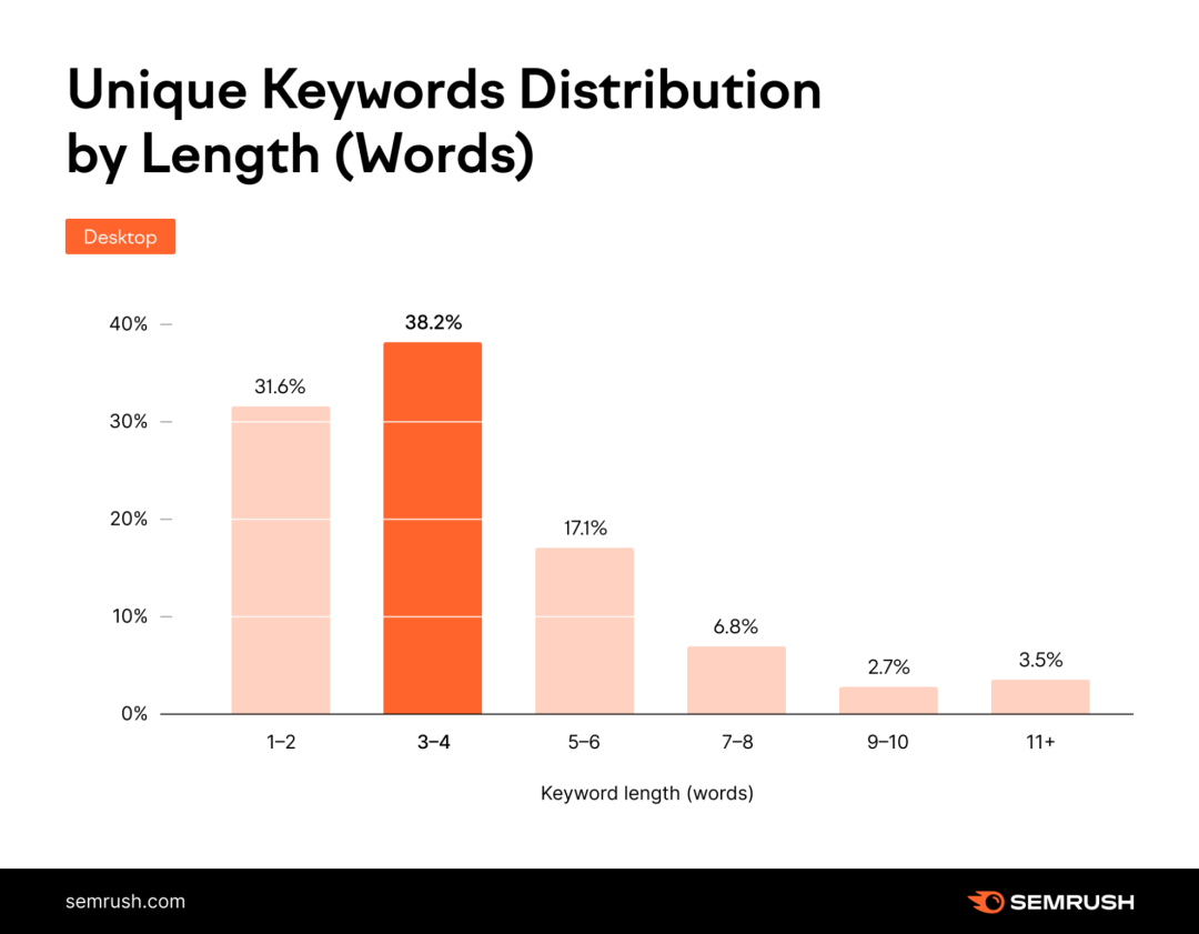 2022年,大多数桌面搜索都是简单直接的,3-4个词的查询频率最高,占38.2%。1-2个单词的搜索紧随其后,占31.6%。用户通常会根据搜索结果快速做出决定(Semrush,2022)