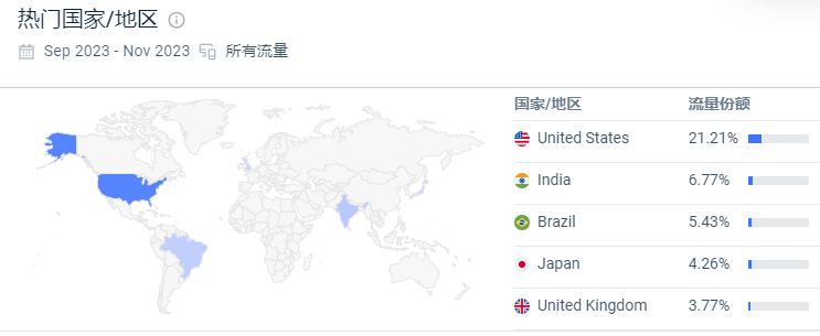 美国是Google.com的最大流量来源,占21.21%;印度(6.77%)、巴西(5.43%)、日本(4.26%)和英国(3.77%)是其他主要贡献者。