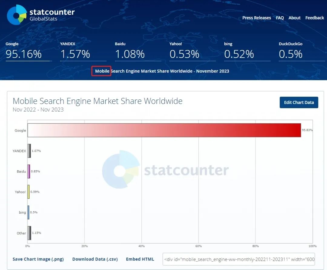 移动搜索:到2023年12月,Google占据了全球移动搜索引擎市场95.16%的主导地位,凸显了其在移动搜索领域的地位。