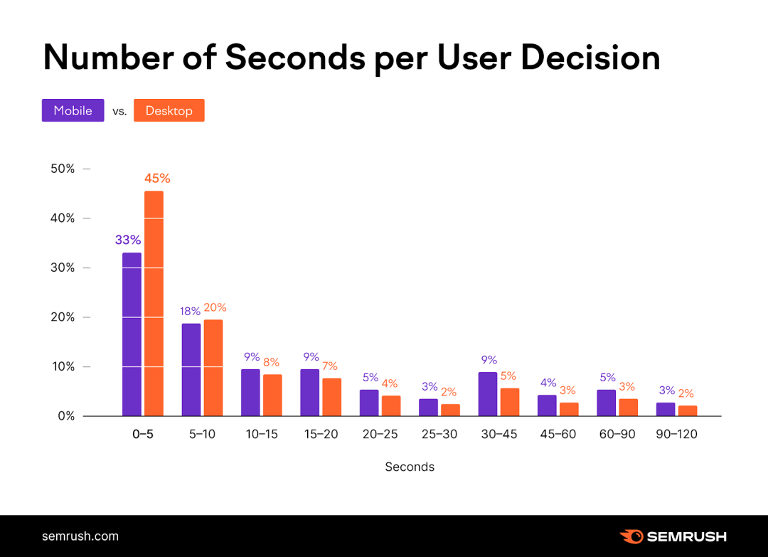 与桌面用户相比,移动用户通常需要稍长的时间来决定下一步行动,33%的人在0-5秒内做出决定,而18%的人则需要5-10秒。(Semrush,2022)