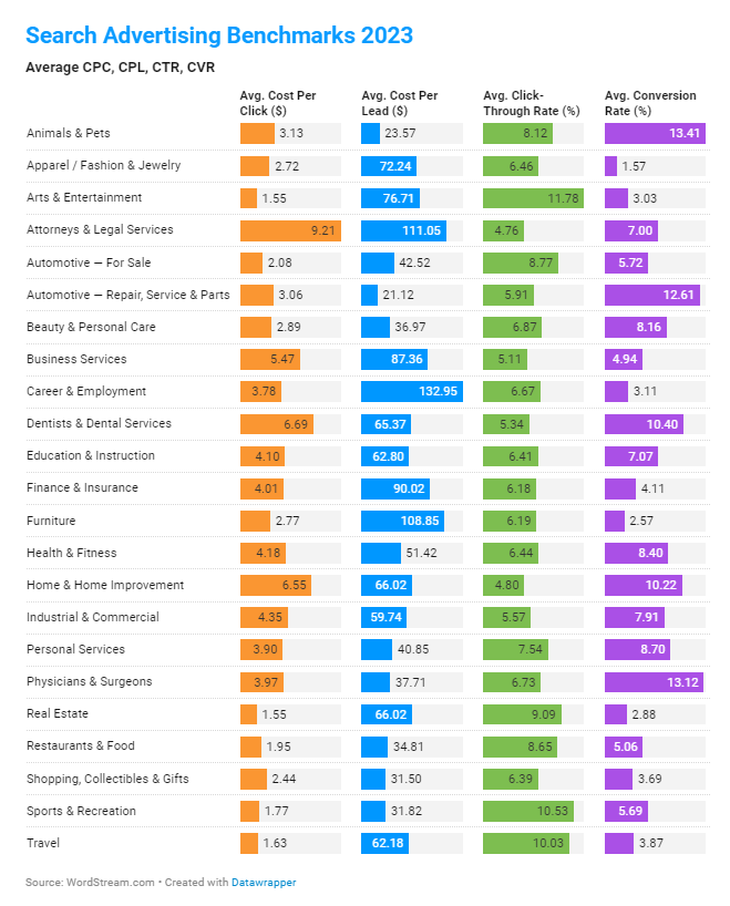 2022-2023年Google Ads的平均每次点击费用 (CPC) 为4.22美元。(Wordstream,2023年)