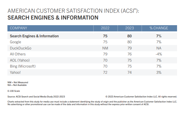 满意度得分上升了7%,从2022年的75分上升到2023年的80分。这一上升突显了Google致力于改进其搜索算法和用户体验。