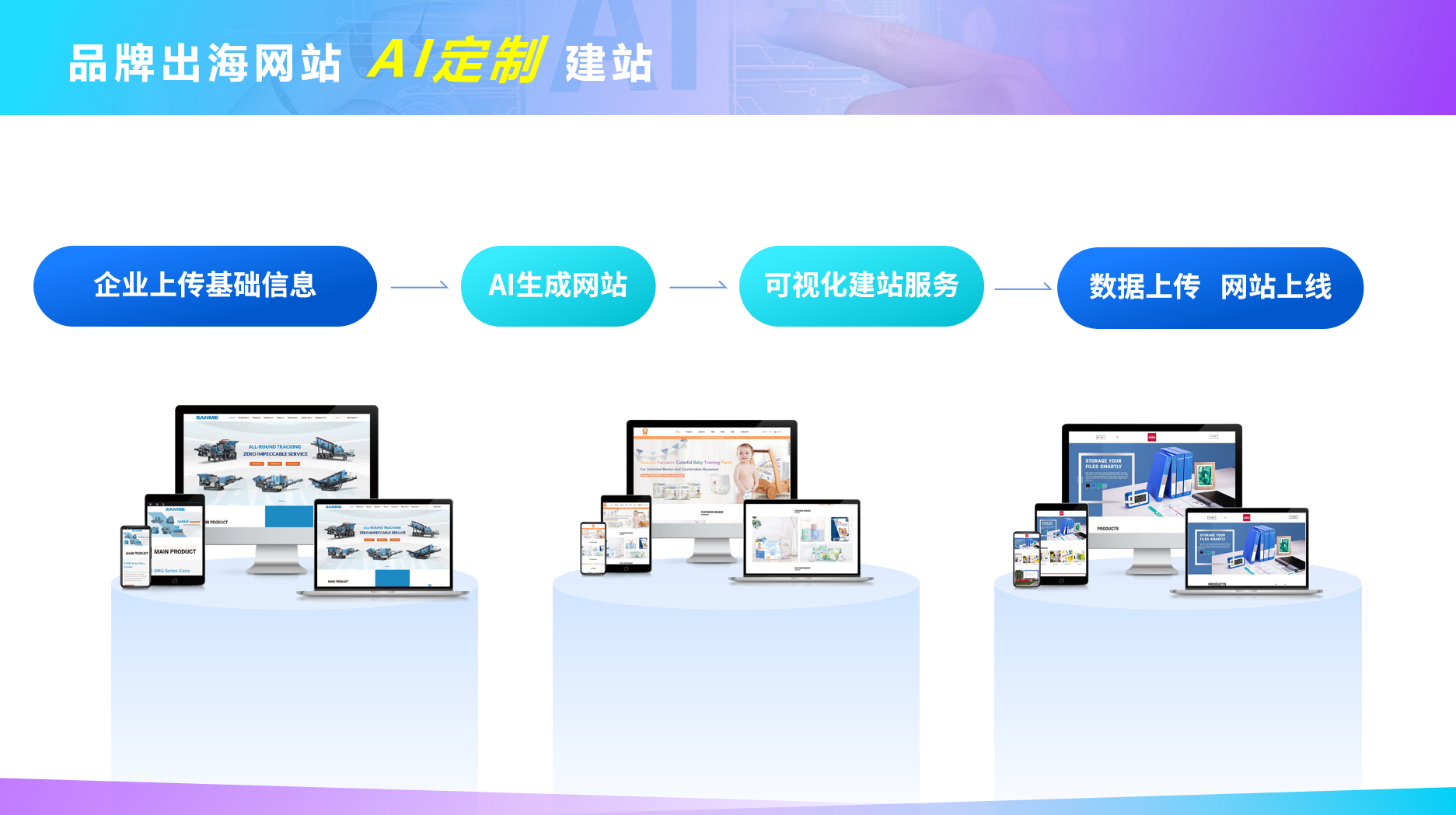特别适用于对海外建站效率有着高要求的外贸企业!企业提供了网站应备的资料后,AI通过自主学习,短短数秒后就可以生成上百种不同风格的网站,用户可在其中挑选最适合的风格,若AI搭建的网站代码符合搜索引擎规则,将网站进行简单调试后即可上线运营!