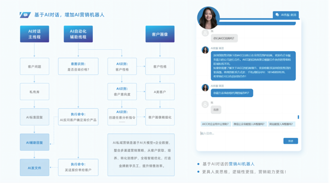 AI可以描绘出各类意向客户的精准画像。通过分析客户的行为、偏好和需求,AI可以更好地了解客户的心理和购买动机。经过训练后的AI可以指定营销任务,并协助进行不同类别的客情维护。它可以自动发送个性化的营销邮件、短信或电话,与客户保持联系并提供定制化的服务。