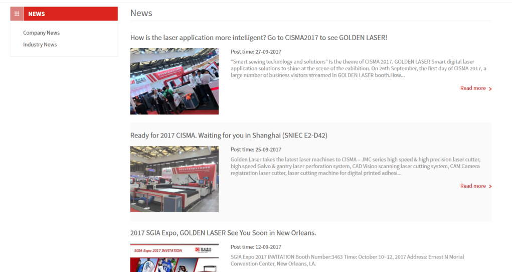 这个很多的外贸企业的营销网站上没有,有也是一些企业介绍、领导介绍之类的应该放到关于我们的内容,让客户没有兴趣继续看下去,这完全是给自己减分。客户主要关心的是产品,那么企业新闻就应该主要是企业新闻(客户来访、企业活动/会议)和产品新闻(新品发布、促销活动)、产品新闻、行业新闻、行业动态。新闻常更新也是利于SEO的优化的,建议1~2篇/周的更新频率。