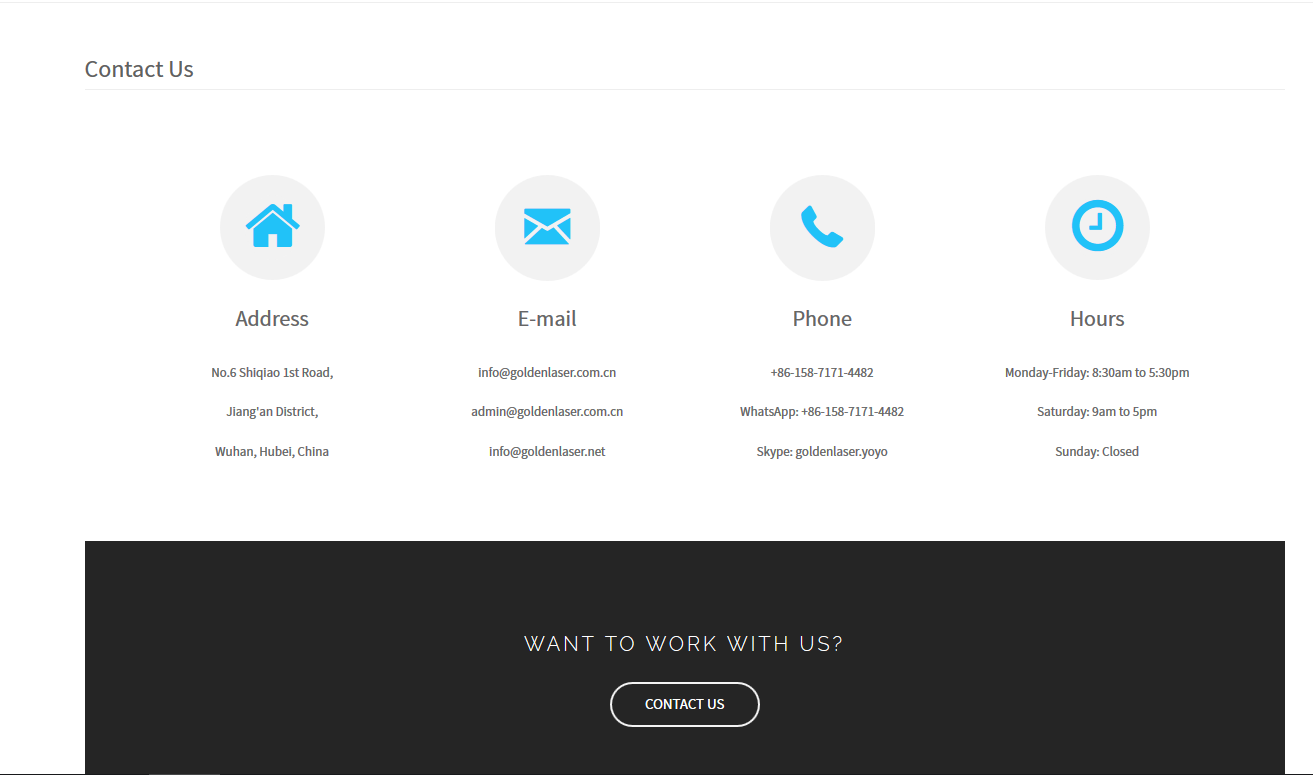 通过前面所有的工作,都是为了引导客户到达联系方式页面。所以在这里联系方式当然是越多越好,但信息要容易找到。大牌在联系方式上总是惜墨如金,主要是怕骚扰;小公司在联系方式上可以全面一点。邮箱,电话,skype,whatsapp,地址,传真可以统统写上。表单也是必不可少,因为用户直接填写,而不用邮件;在页面放一个谷歌地图也不错。如果是大工厂,对市场和职能进行分工,那需要写明市场部,业务部,售后部分,技术部门;南、北美市场等等。还有我们最好加上社交网络的链接,例如Facebook、Google+等,这对于提升客户信任和我们对网站的推广是非常有必要的。