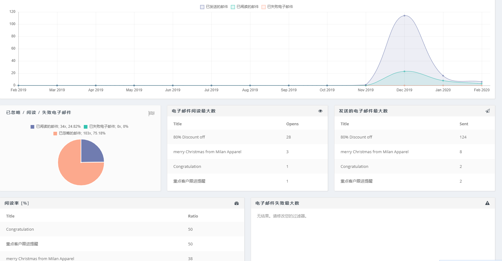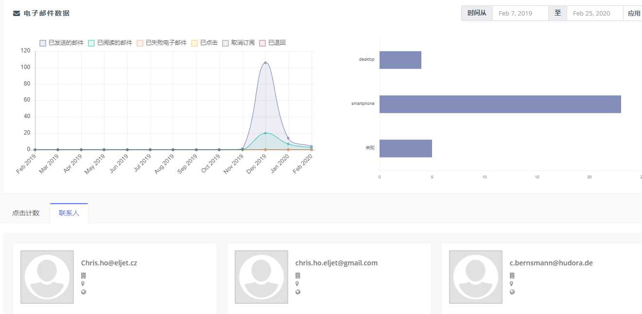 在邮件发送完成后,邮件发送情况的跟踪也尤其重要。数据大师除了入眼就能看到的邮件数据之外,还有很多有价值的信息也在自动生成数据报表。