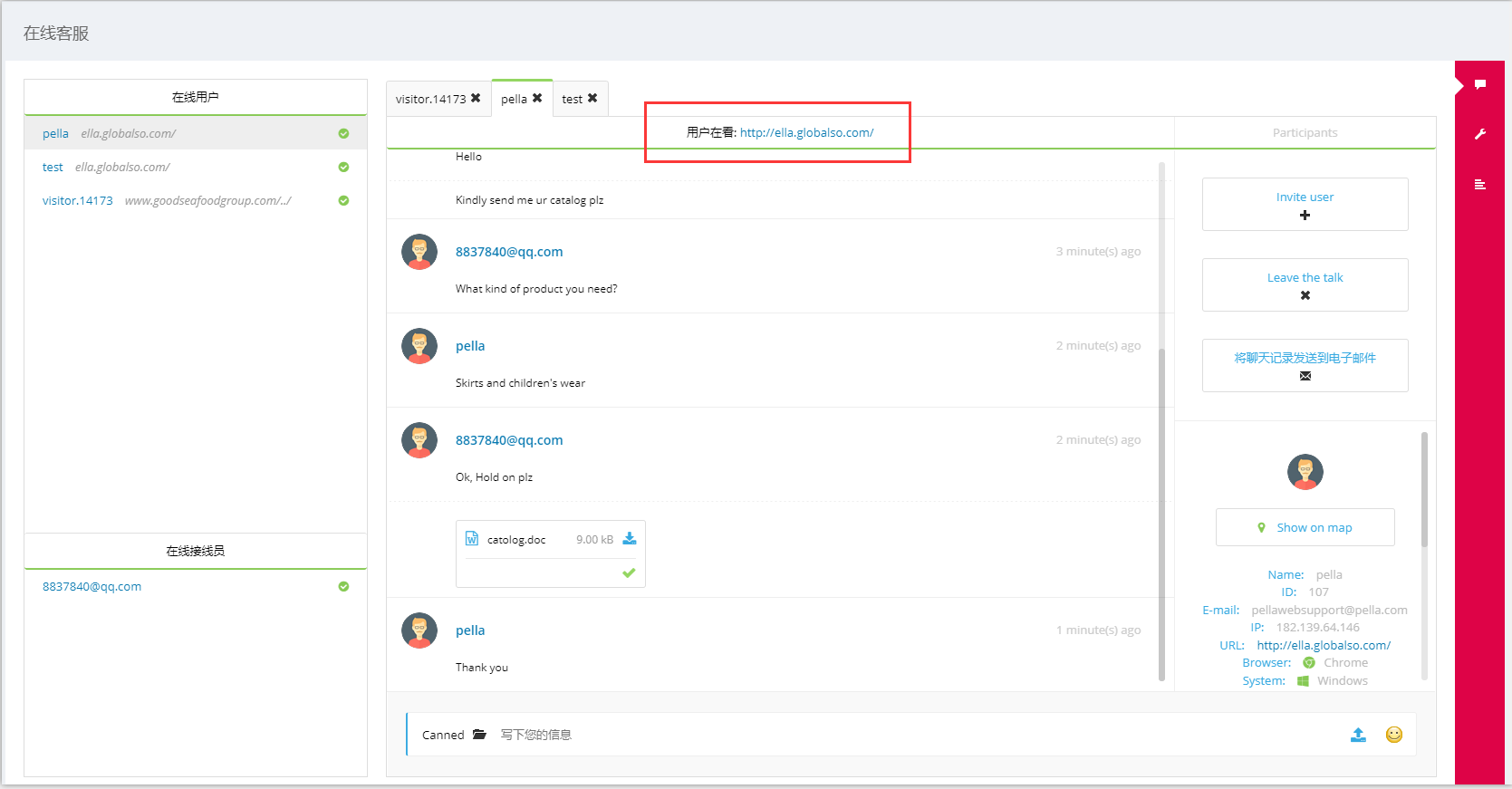 此外,数据大师还带有在线聊天功能,能够实时追踪客户正在看的网站,有针对性的做产品服务;聊天结束后,你还可以将你们的聊天记录发送至你的邮箱,避免内容遗忘。