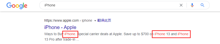 当描述中的内容正好与搜索请求相匹配时,Google会将描述里的相匹配的词标红(以前是加粗),以提升在搜索引擎结果页面中的点击率。