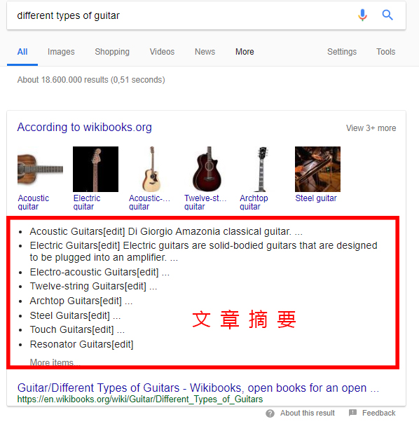 这一类型的内容很容易会被分享转载,因为他在分享观点、小贴士、评论、解说方面很有作用。还有机会出现在丰富文章摘要里。例如,搜索“不同种类的吉他”,列表帖子中的数据会很直观地展现出来。