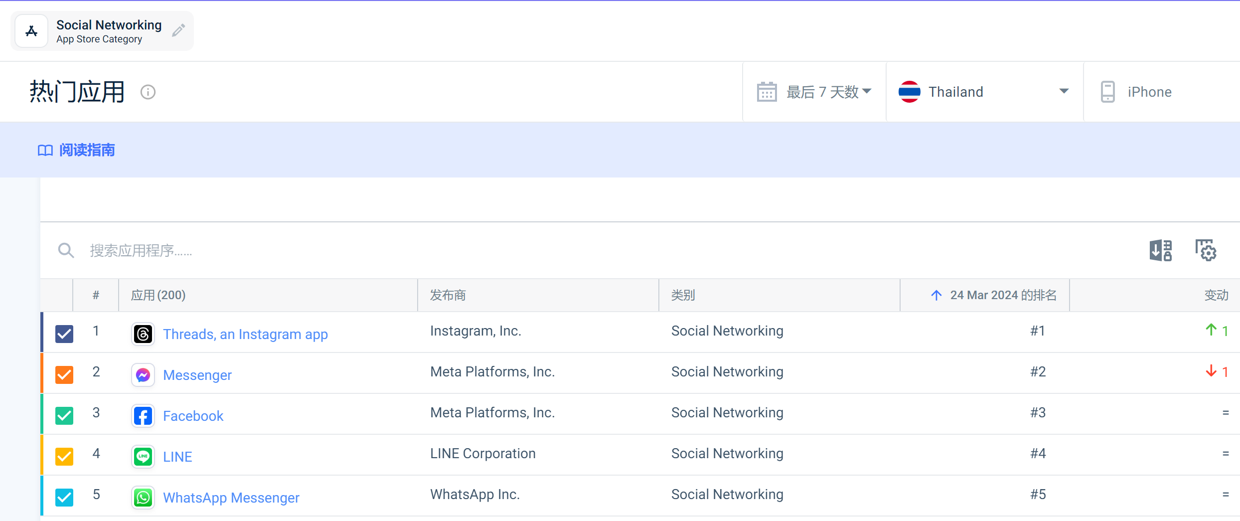 据Simlarweb统计数据可知:泰国国内前五热门社交网络软件分别是Instagram旗下的Threads,Messenger,Facebook,LINE,WhatsApp Messenger。