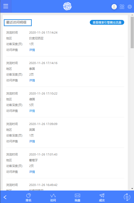 正如刘经理之前提到的,B2B类型的外贸企业,客户基数不会太庞大,但重要的是质量,那么流量涌入私域流量池以后,就要对访客进行深度分析。全球搜AI智能分析系统,将结合访客的浏览轨迹、互动频次、流量来源等行为,形成访客的用户画像,并通过大数据采集分析,呈现精准的联系方式以及身份背景,实现高质量客户转化。