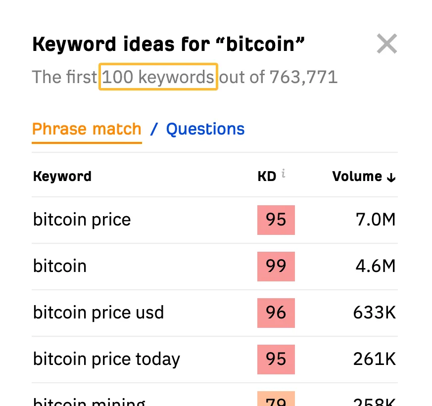 关键词生成器可以为任何关键词找到多个长尾衍生关键词,以及相关问题类型的关键词。对于每个列表中的前十个关键字,还显示了KD(同上)分数。