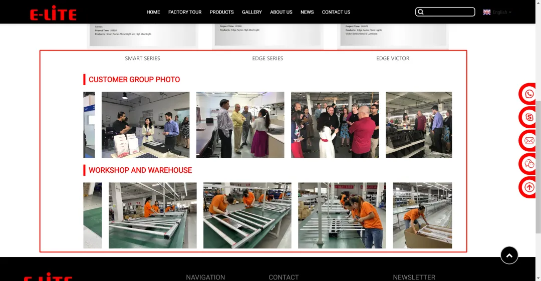 该企业主要以LED照明设备、工矿灯、泛光灯出口为主,是国家高新技术,也是西南地区最大的LED路灯出口企业。企业的受众是高标准化的高端客户群体,一般是大批量定制化订单,客户对供应商的生产能力及供应链的稳定性非常看重,其便在独立站页面大量展示了工厂实景及客户来访照片来提高用户的信任度。