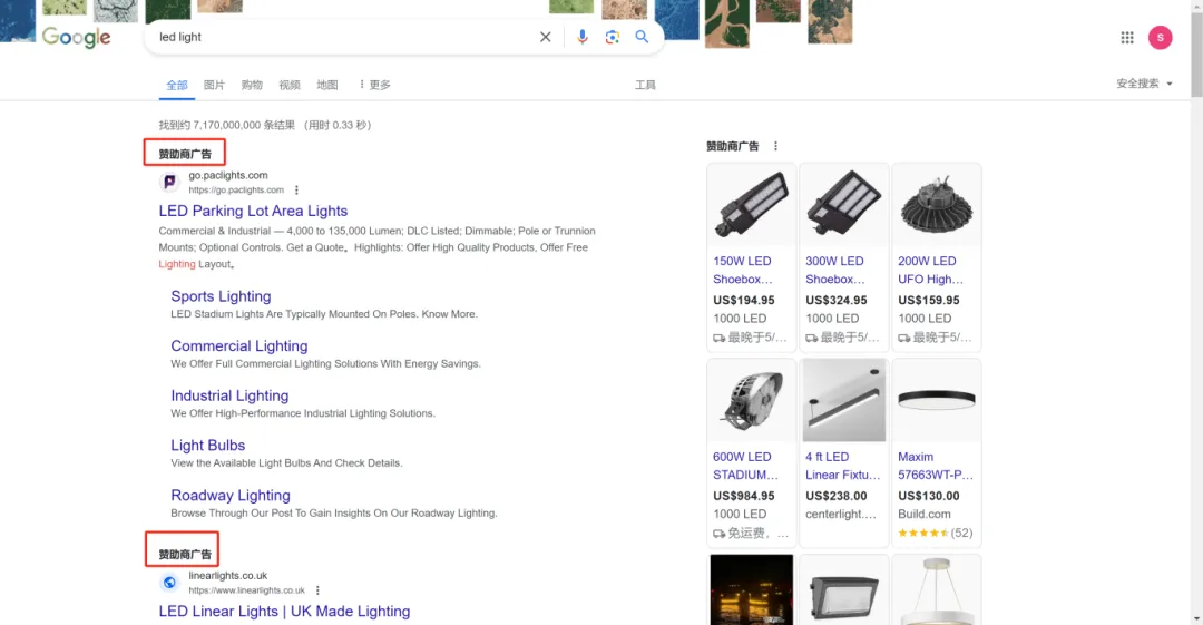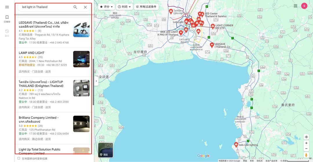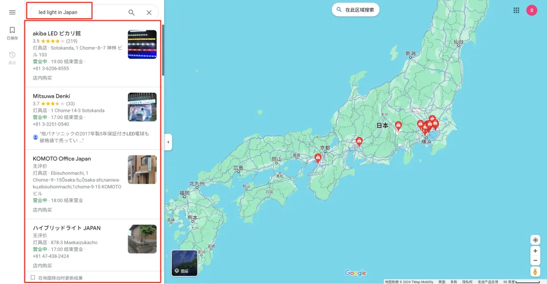 利用产品通用叫法在Google my business所支持的区域进行搜索,如需要查看谷歌地图上做led light市场的日本企业,则在搜索框中输入led light in Japan,点击地图栏,左侧会出现该区域与关键词匹配的企业。