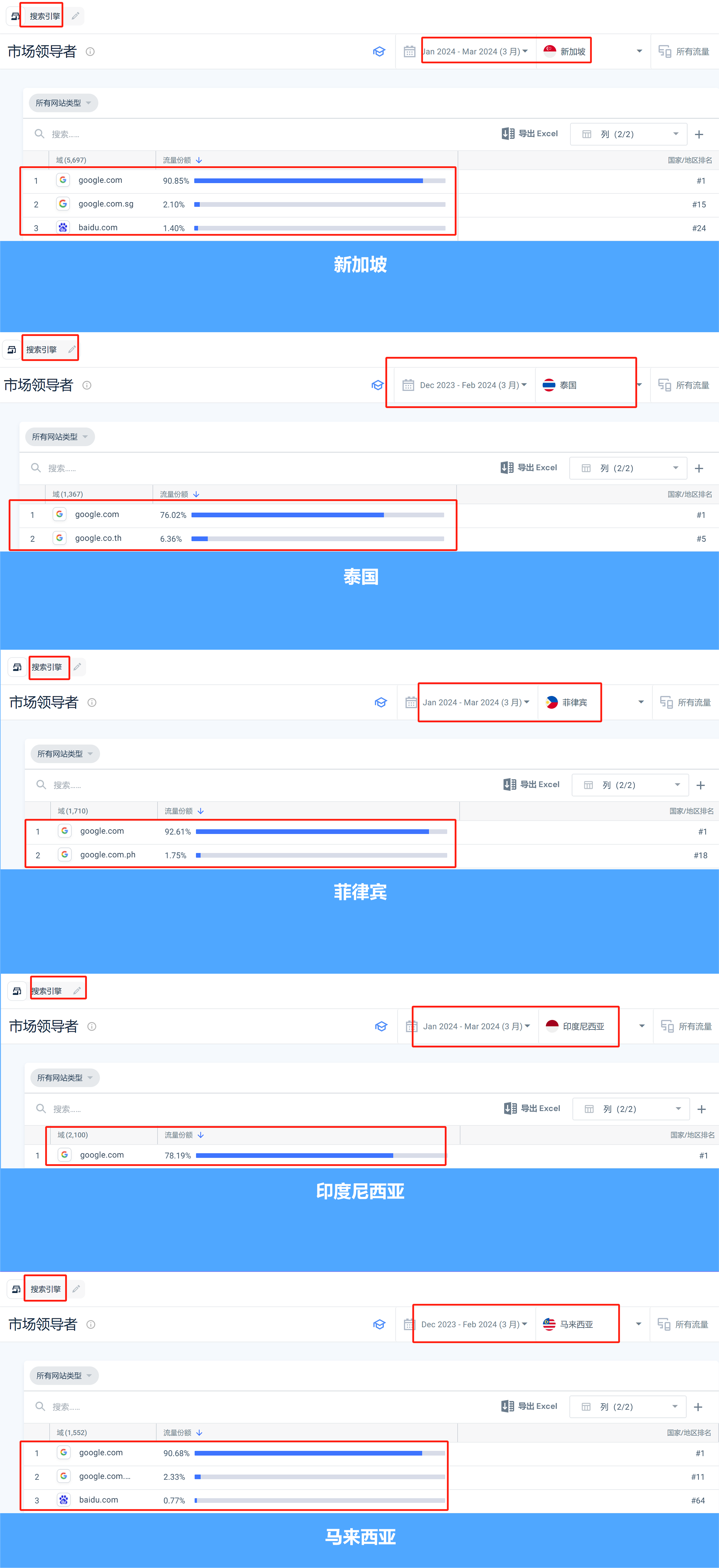 由数据可知,google.com为东南亚大部分国家最常用的搜索引擎,区域市场占比超70%,这意味着谷歌拥有庞大的潜在客户群体。接下来将以谷歌为例介绍搜索引擎的客户开发方式。