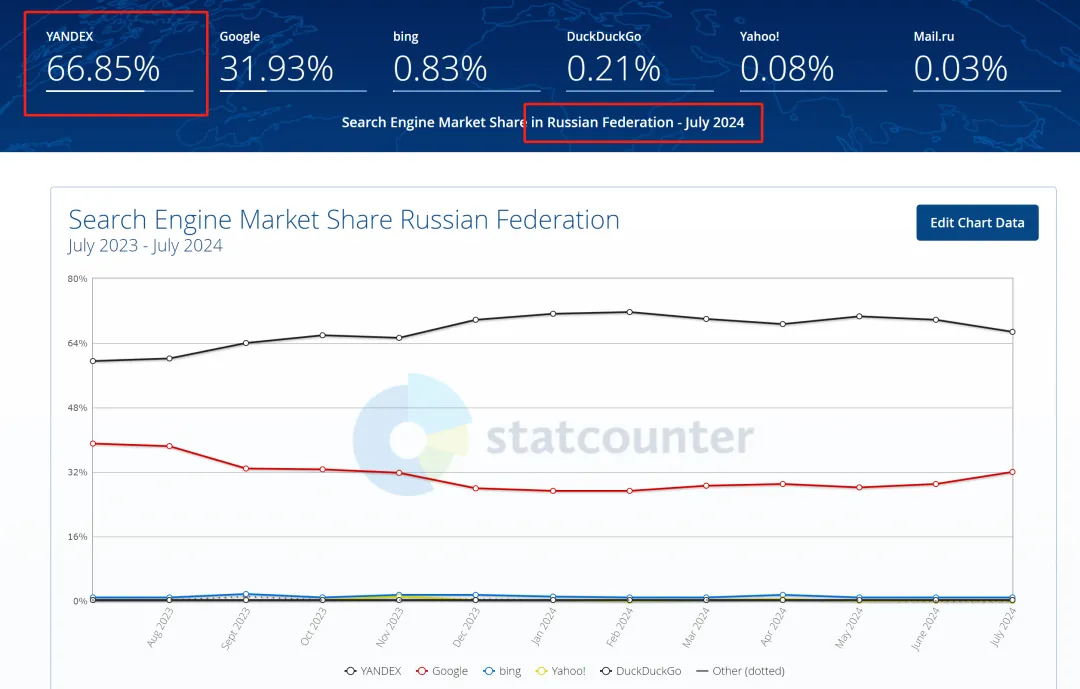 Statcounter统计数据显示:Yandex在俄罗斯的搜索市场份额占比中远超其他,达到66.85%,成为俄罗斯搜索引擎市场的领军者。
