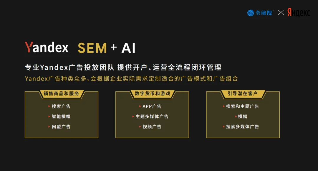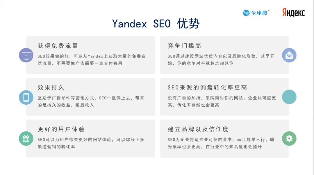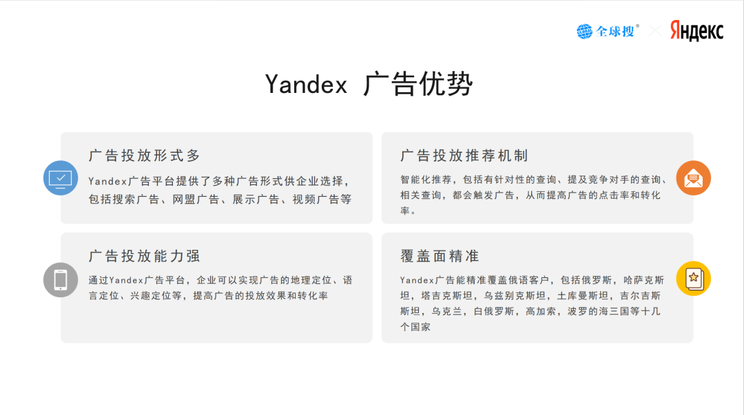 全球搜作为Yandex大中华区官方合作伙伴,拥有专业的推广技术及服务意识,若您还需要了解Yandex营销的更多内容,可以扫码关注全球搜微信公众号获取!