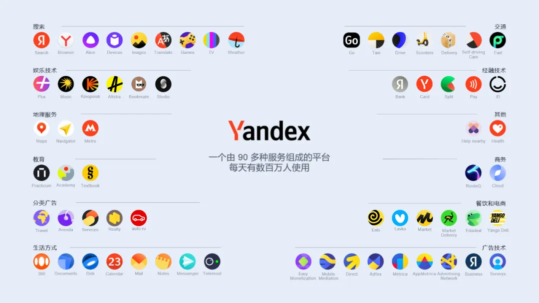 Yandex作为俄罗斯本土的搜索引擎,对于当地用户来说,它不仅是搜索引擎,还提供多种服务,如打车APP、地图服务、电商平台、外卖服务、视频软件和邮箱等,形成了丰富的产品生态链。