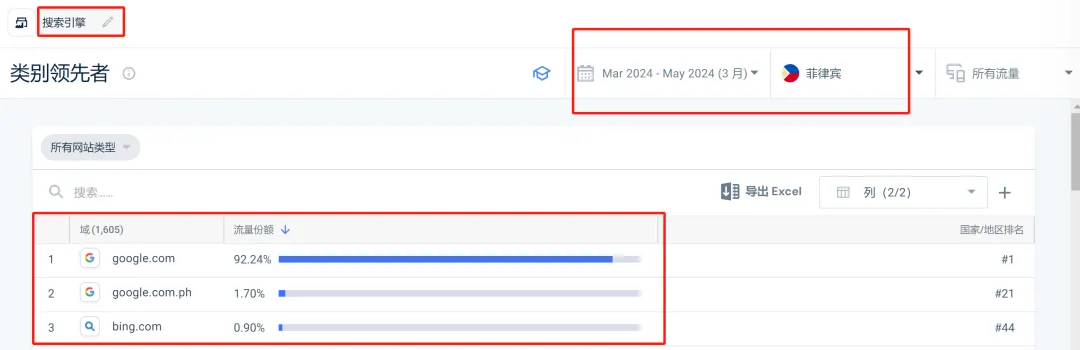 simlarweb上,菲律宾市场搜索引擎类别近三个月的表现可以看出,google.com占据了绝对的市场。