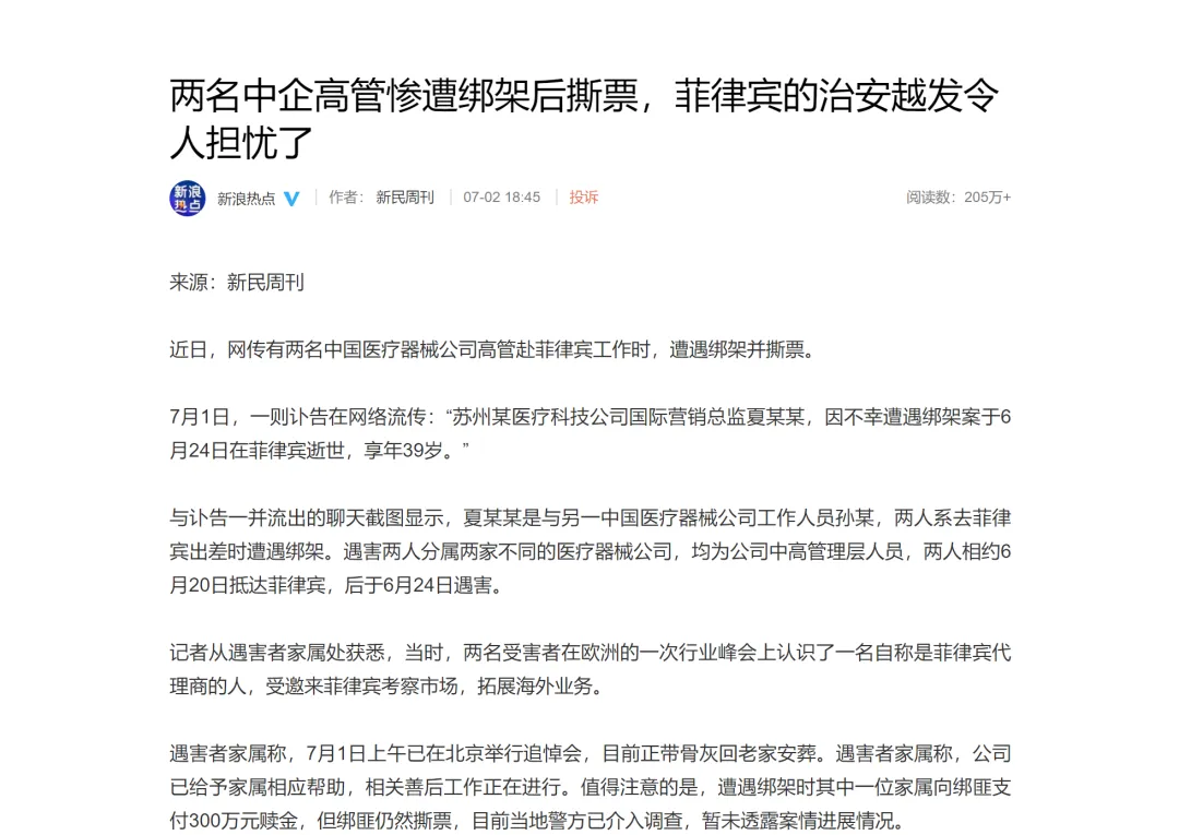 近日,新民周刊陈述道有两名中企高管在菲律宾工作时惨遭绑架后撕票(事件仅供参考)的新闻引发网友热议,小编温馨提示大家在各国进行外贸工作时,一定要时刻保持警惕,注意自身安全!
