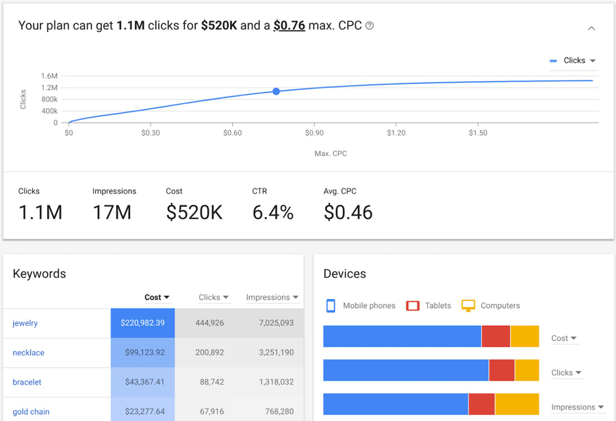在下面的示例中你可以看到关键字规划师的新界面,包括新的预测部分: