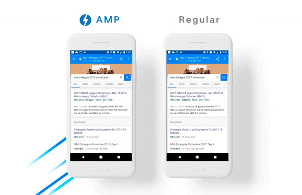上图为某网站加了AMP项目后,在移动设备端的评分,以及在移动手机端的展示情况。我们可以发现,网站评分相当不错,且在移动端有专门的闪电符号专属标识。