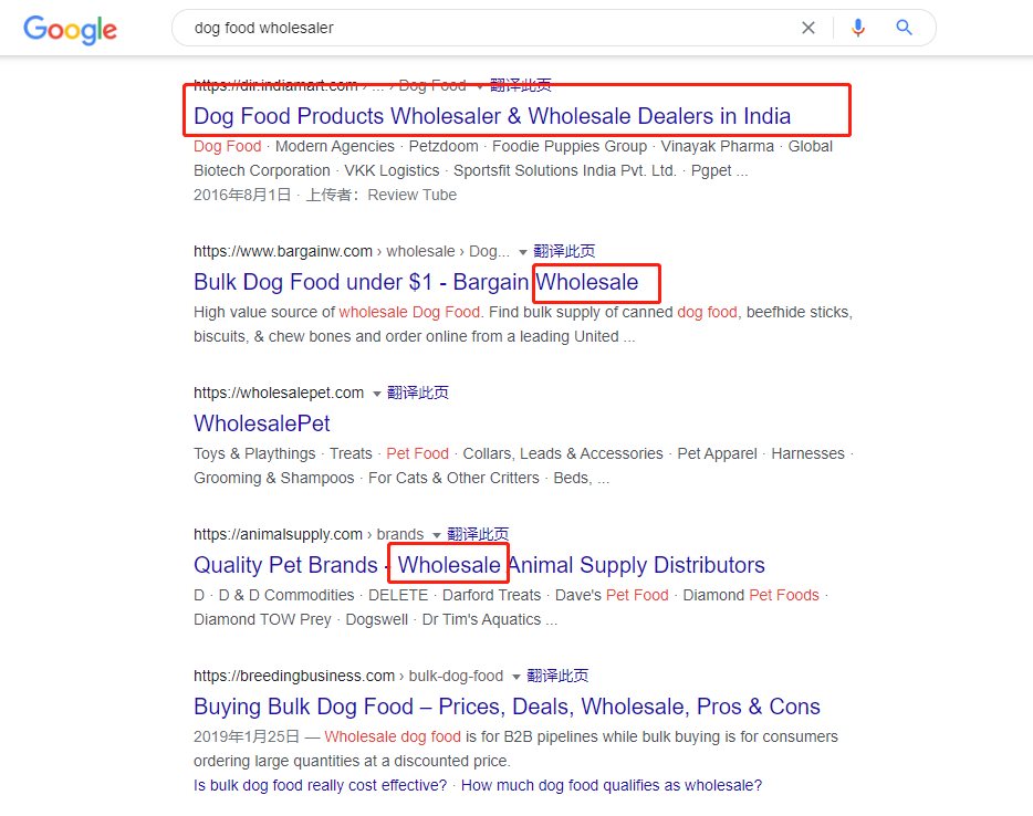 然后我们来转变一下角色,假如你现在是一个国外的零售商,想要批发一批狗粮,你会在谷歌搜索什么?