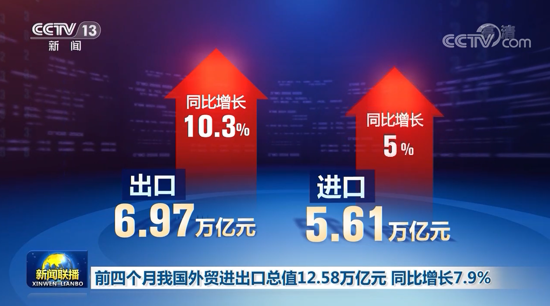 5月9日,海关总署公布今年第一季度我国外贸数据。据统计,今年前4个月,我国外贸进出口总值12.58万亿元,同比增长7.9%。其中,出口6.97万亿元,同比增长10.3%;进口5.61万亿元,同比增长5%;贸易顺差1.36万亿元,增加39.2%。