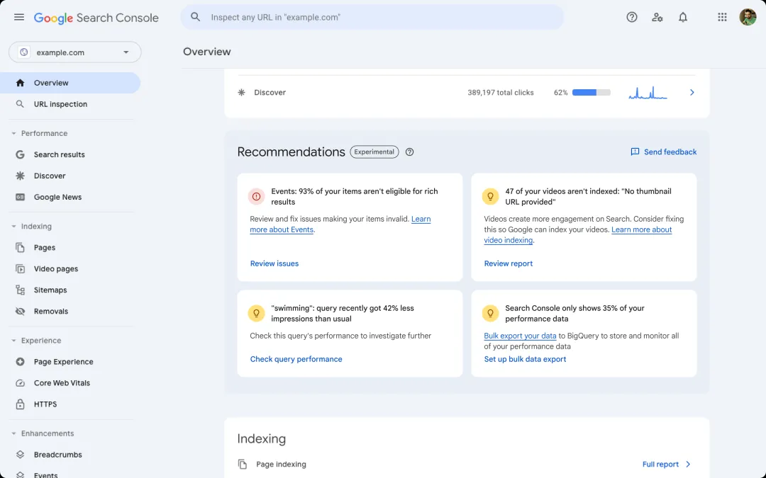 谷歌声明这些建议是根据各种Google搜索系统数据(例如索引编制、抓取和呈现数据)得出的。建议会显示在 Search Console 概览页面中。