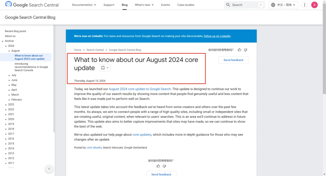 时间来到8月15日,谷歌官方于Google Search Central Blog发布了一篇新的谷歌算法更新文章,接下来让小编为您详细剖析: