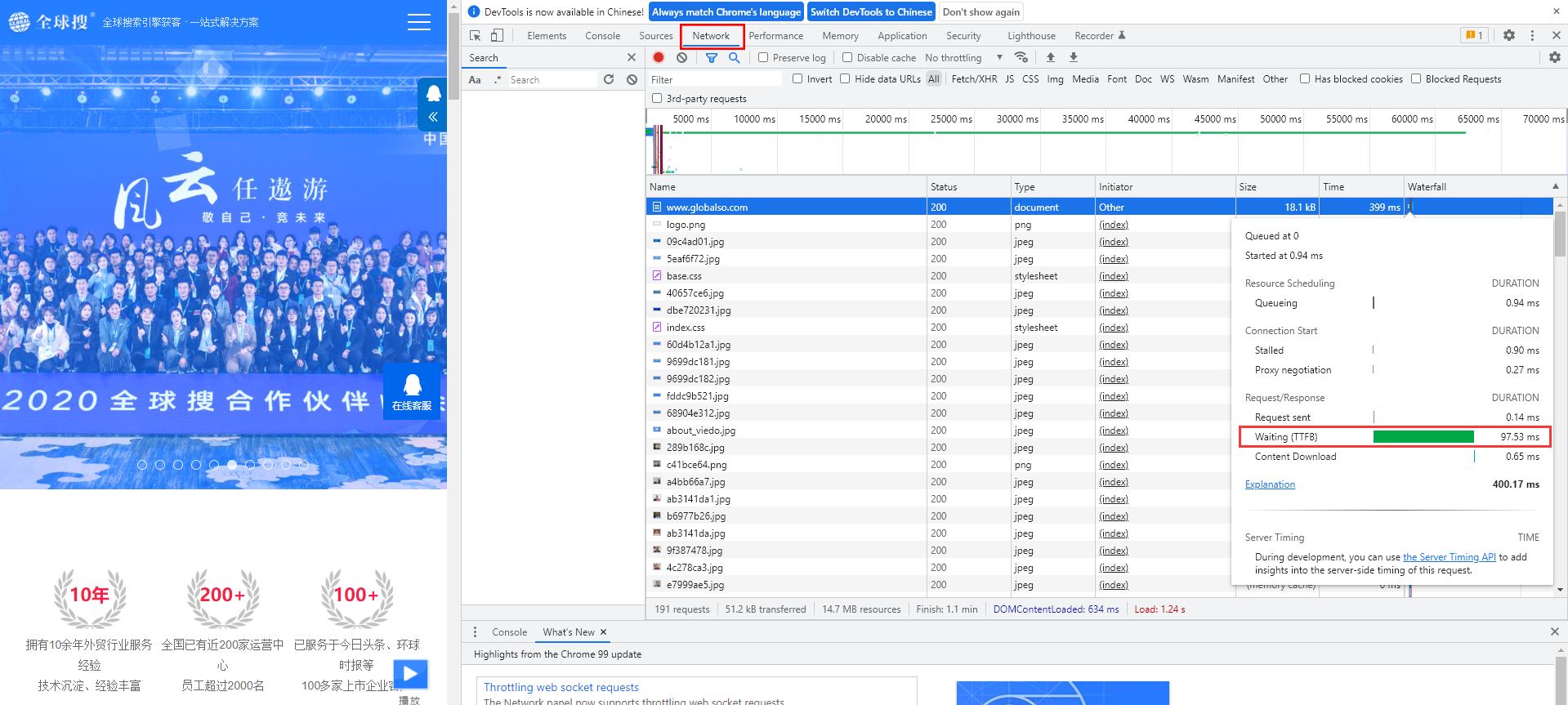 在图片上所示位置即可查看每一个资源的载入时间和网站的Waiting(TTFB)时间。