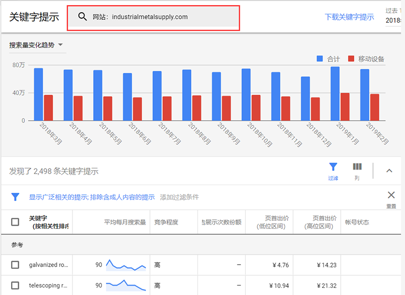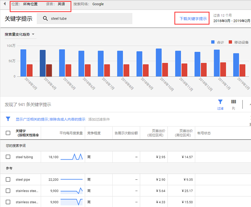 以关键词steel tube为例,我们可以看到关键词每个月的搜索量和热度。