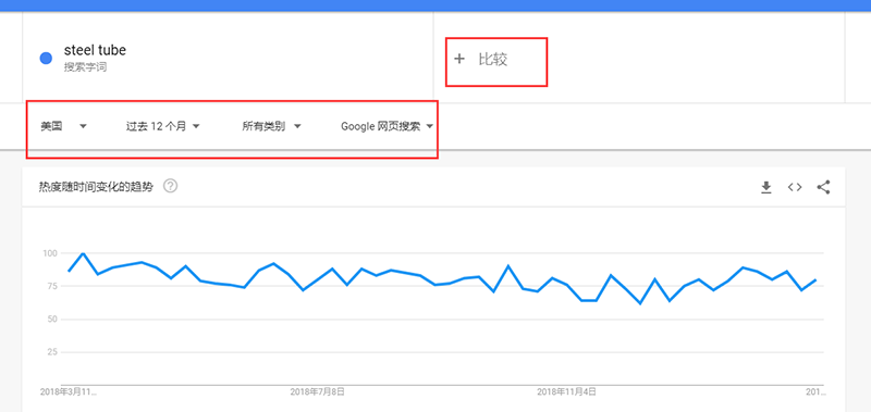 同样以steel tube为例,我们可以在关键词的下方选择地区、时间等。也可以加入一些其他的关键词来比较。