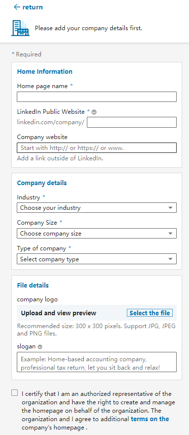 关于档案详细信息,请确保选择与品牌一致的徽标,企业logo。并要符合LinkedIn的特定大小,即300 x 300像素以及JPG,JPEG或PNG。