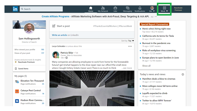 1、用个人的账户登陆领英,选择窗口右上角个人资料图标右侧的“Work”标签。