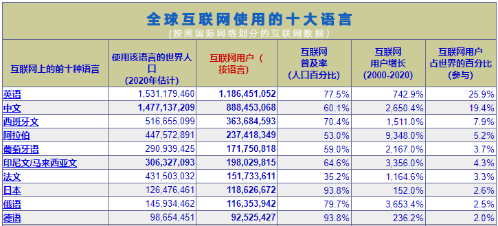 全球互联网排名前十的语言
