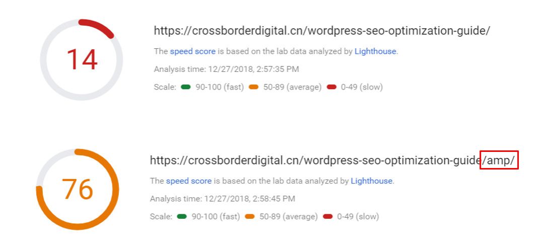 实施AMP后,页面加载速度会获得大幅提升,如下图Cross Border Digital的一篇博文,谷歌测速工具得分,AMP页面得分76,原页面仅14。