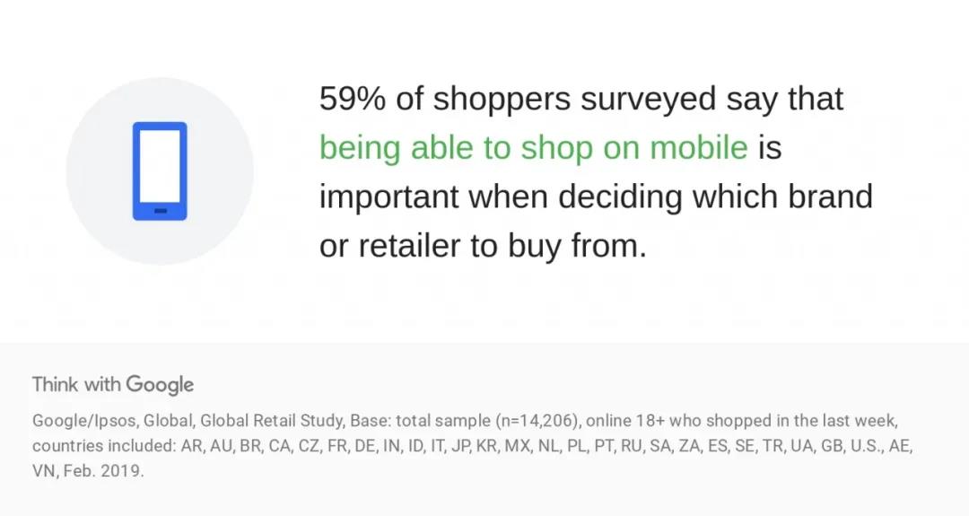根据Google的调查,有59%的购物者表示,在决定从哪个零售商或品牌购买商品时,能够在其移动设备上购物非常重要。