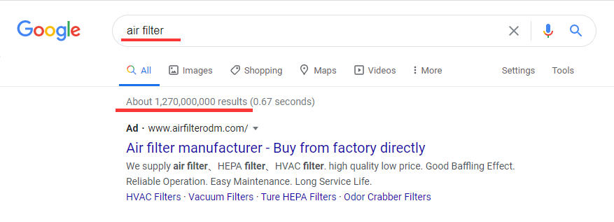 核心主词:与企业产品相关的,行业相关的词。一般行业大词都是过于宽泛的词,比如包装机械产品的具体名称,比如我们是空气过滤器的,air filter就是产品词。