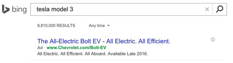 如上图,雪佛兰公司利用特斯拉模型3的发布,投放广告,其搜索量飙升。雪佛兰的广告提醒用户,他们的车将在2016年底上市,没有明确的时间,但实际上市时间比特斯拉模型3预计到达的时间早。