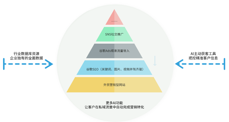 谷歌SEO,通过搜索引擎优化,让网站以自然的方式排名谷歌首页,这个过程是一个长期的,需要企业做好长期投入的准备,一旦成功,企业站点将获得源源不断的免费流量,且这些流量的合作意愿是所有引流方式中最强烈的,因为他们对你的产品以及企业都有了充分的肯定,是很多外贸企业很早就会投入的一项私域流量营销战略。