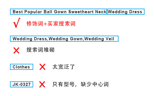 其实这是个误区,产品名称罗列和堆砌不但不会提升我们产品曝光的可能,反而会降低我们的产品与买家搜索词匹配的精度,影响买家的用户体验,从而影响搜索结果和排名。