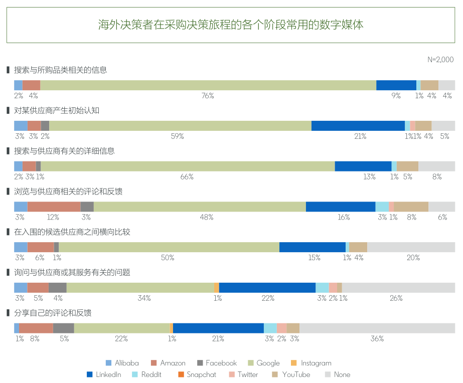 我们首先来看,LinkedIn官方调查给出的报告,在海外市场中,采购决策中各阶段常用的数字媒体: