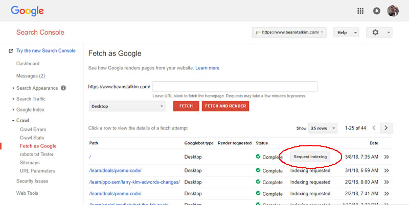 在获取你的URL之后,你将会看到“请求索引”的选项。